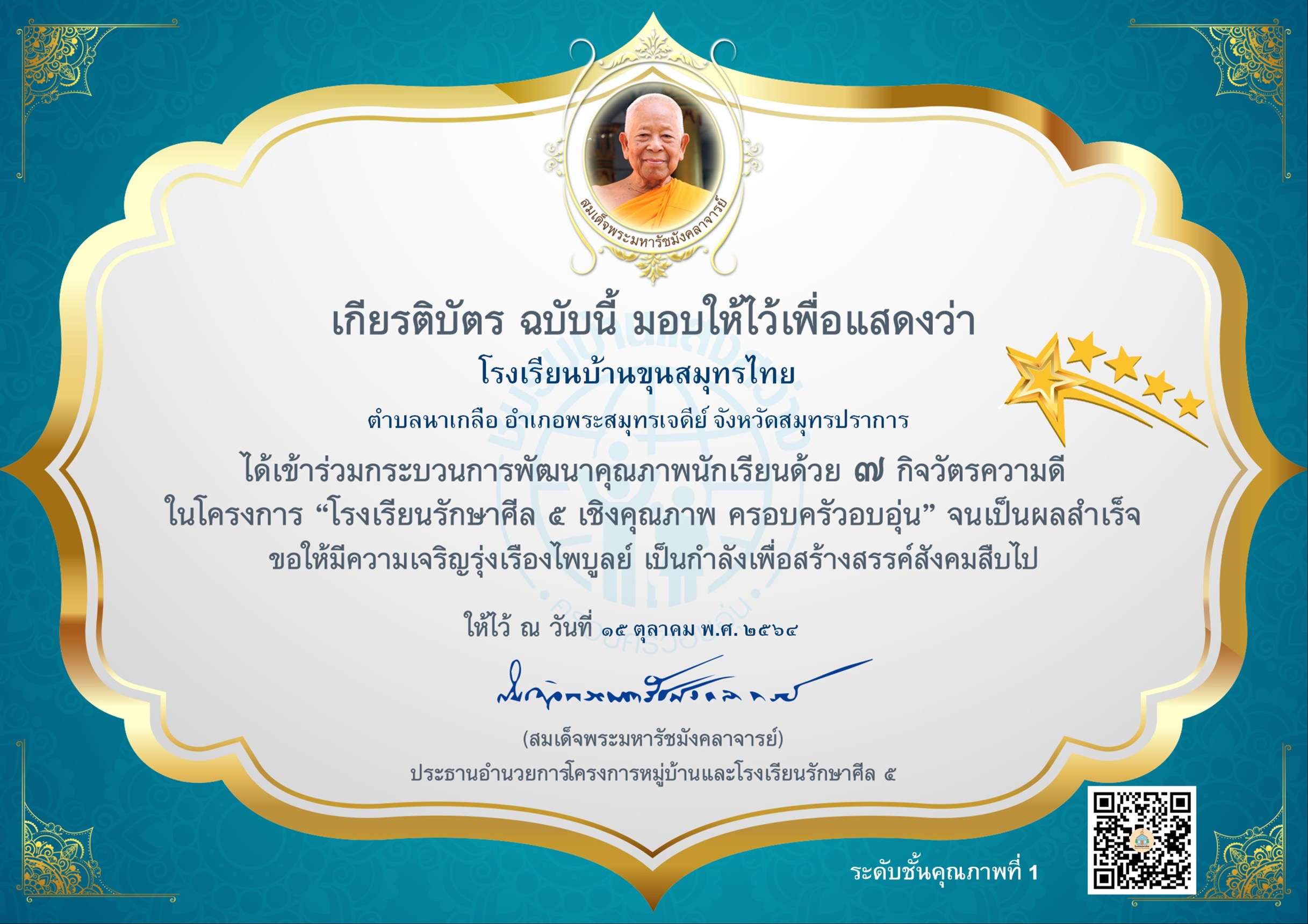 ดร.ปิ่นทอง ใจสุทธิ ผู้อำนวยการโรงเรียน พร้อมด้วยคณะครู นักเรียน โรงเรียนบ้านขุนสมุทรไทย(จ้อย อบเชยอุทิศ) ได้เข้าร่วมกิจกรรมโรงเรียนรักษาศีล5 เชิงคุณภาพ ครอบครัวอบอุ่น พัฒนาเยาวชนด้วยนวัตกรรม 7 กิจวัตรความดี สร้างสังคมแห่งการเรียนรู้ในศตวรรษที่ 21 ประจำปีการศึกษา 2564 S:1