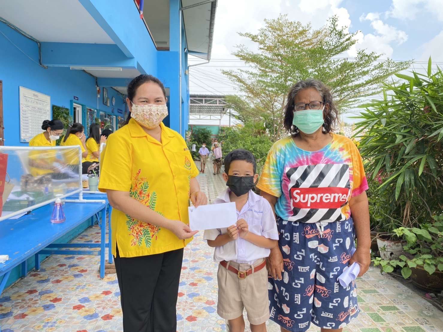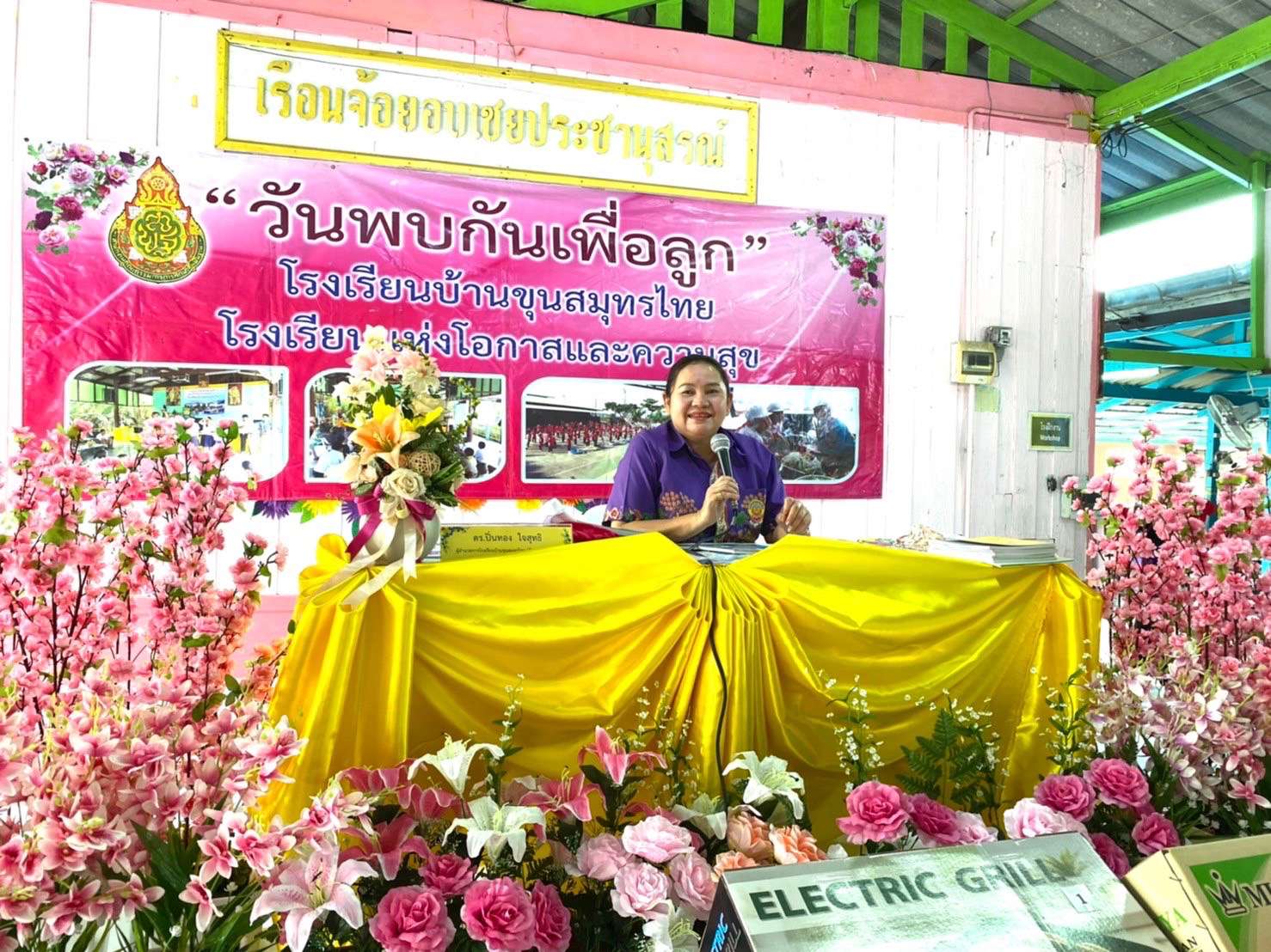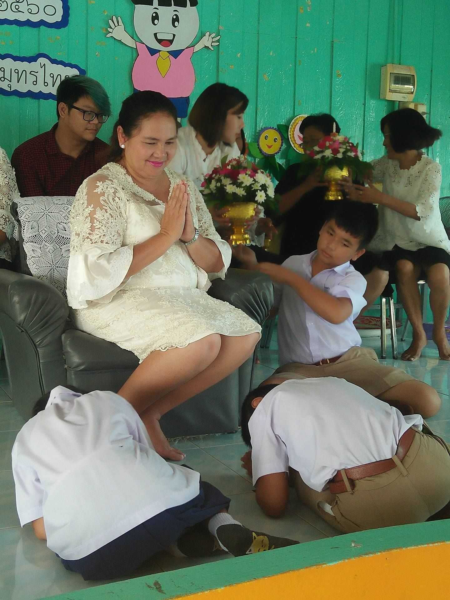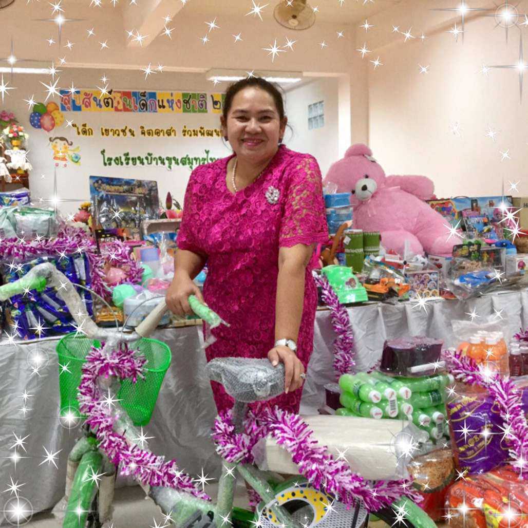 (ครูกุ้ง) พรธนพงศ์เกษม และครอบครัวที่นำไอศกรีมมามอบให้กับทางโรงเรียน เพื่อร่วมแสดงความยินดีกับผู้อำนวยการฐิรชญา มหาสุข ที่ย้ายมาดำรงตำแหน่งผู้อำนวยการโรงเรียนบ้านขุนสมุทรไทย (จ้อย-อบเชย อุทิศ)
