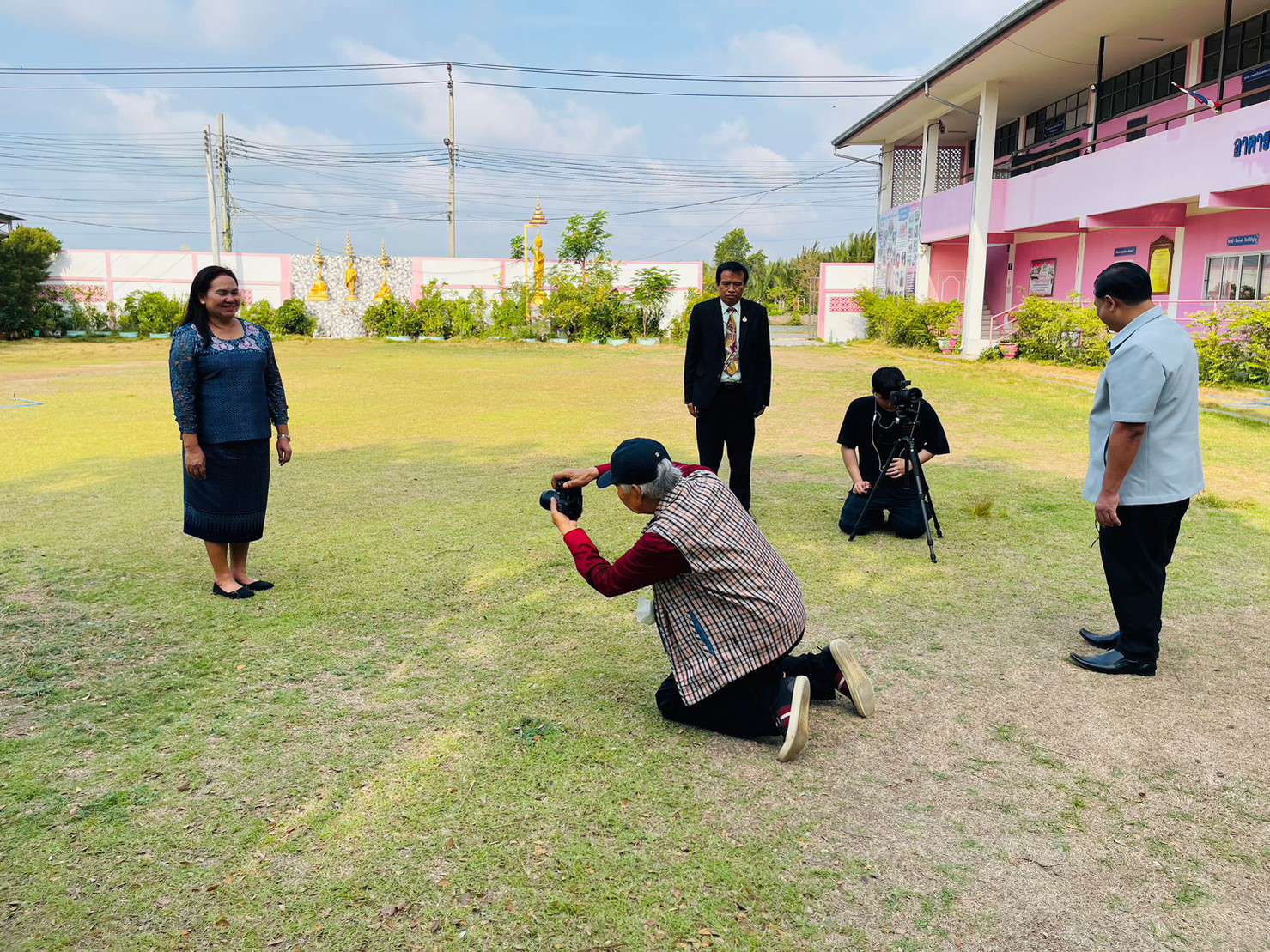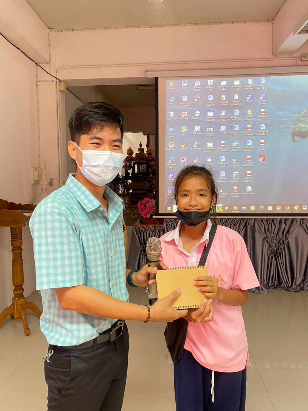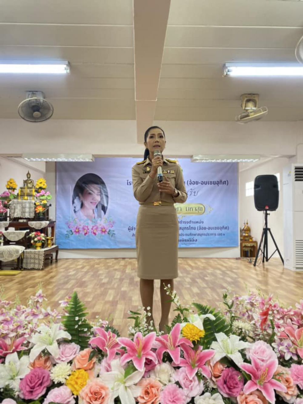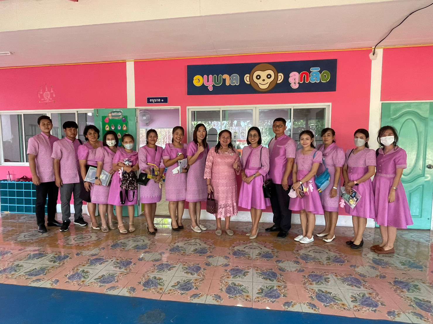 (ครูกุ้ง) พรธนพงศ์เกษม และครอบครัวที่นำไอศกรีมมามอบให้กับทางโรงเรียน เพื่อร่วมแสดงความยินดีกับผู้อำนวยการฐิรชญา มหาสุข ที่ย้ายมาดำรงตำแหน่งผู้อำนวยการโรงเรียนบ้านขุนสมุทรไทย (จ้อย-อบเชย อุทิศ)