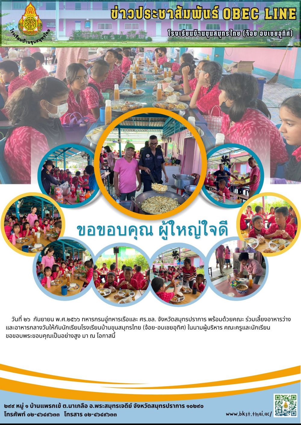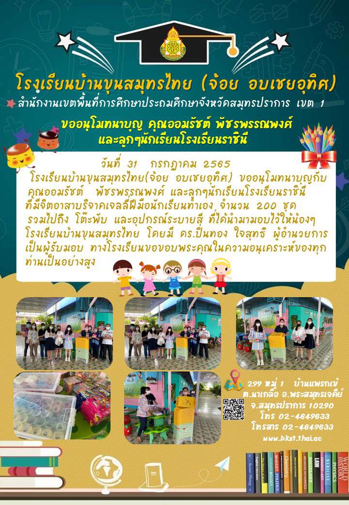 ศรชล.จังหวัดสมุทรปราการร่วมกับโรงเรียนนายเรือ มอบหนังสือเทิดพระเกียรติ 100 ปี เสด็จเตี่ย พร้อมเครื่องอุปโภคบริโภค น้ำดื่ม ให้กับโรงเรียนบ้านขุนสมุทรไทย