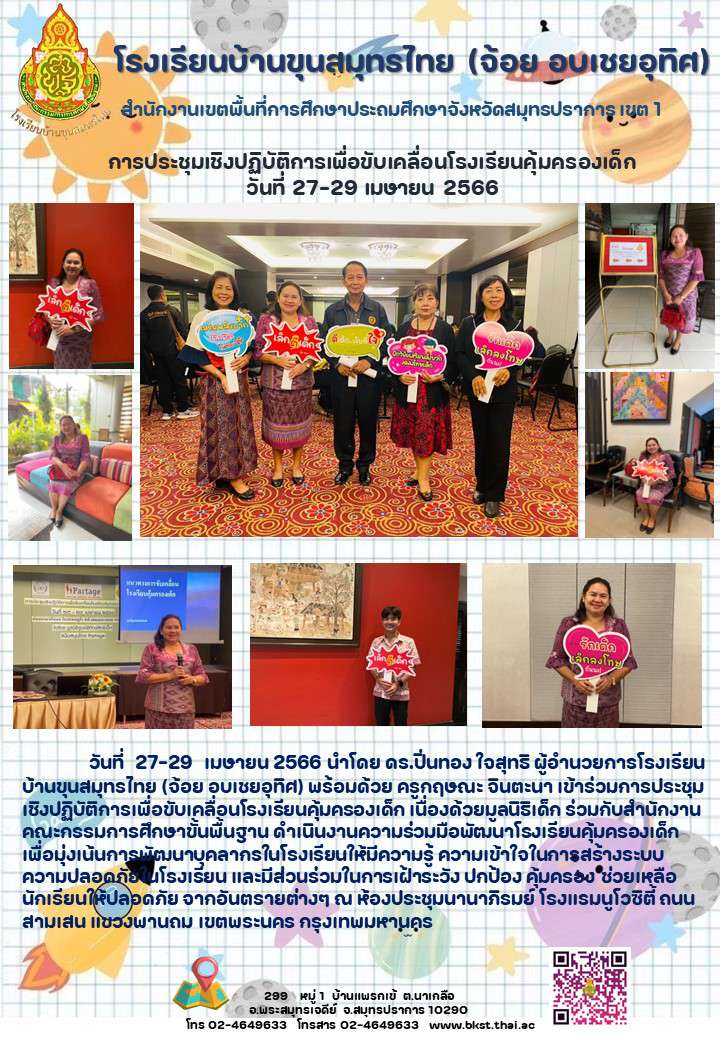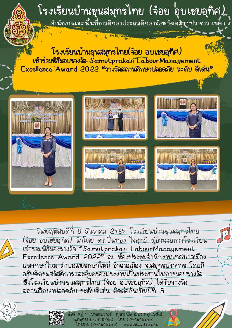 โรงเรียนบ้านขุนสมุทรไทย (จ้อย-อบเชย อุทิศ) ได้รับรางวัลสถานศึกษาปลอดภัย ระดับดีเด่น ปีที่ ๕ ติดต่อกัน จากกรมสวัสดิการและคุ้มครองแรงงาน