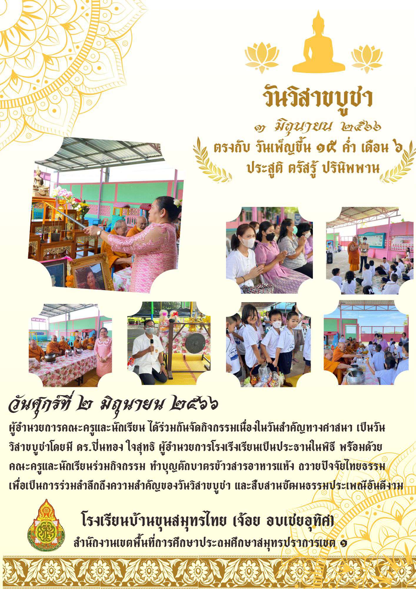 วันที่ ๒๗ พฤศจิกายน ๒๕๖๖ คณะครูและนักเรียนโรงเรียนบ้านขุนสมุทรไทย (จ้อย อบเชยอุทิศ) ได้จัดกิจกรรมสืบสานประเพณีวันลอยกระทงประจำปี ๒๕๖๖