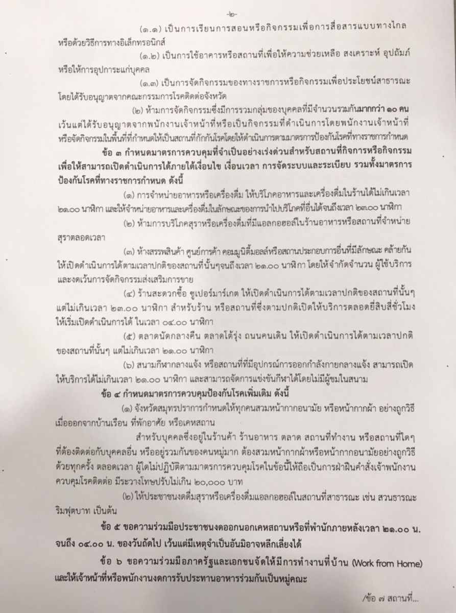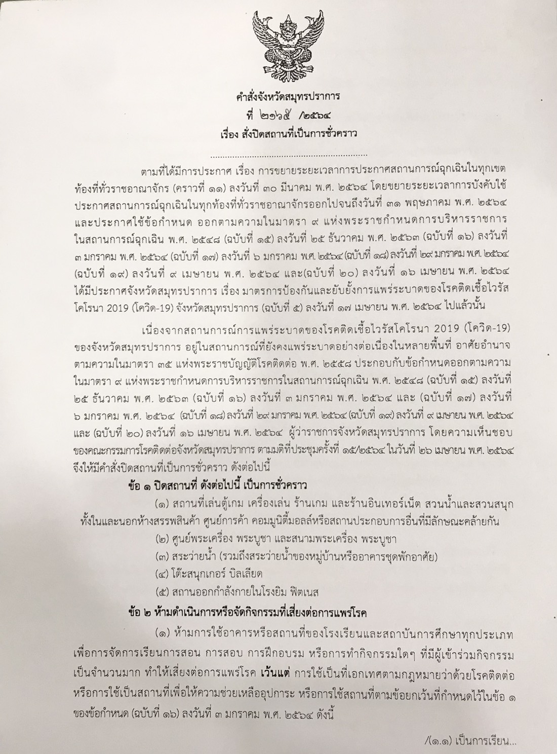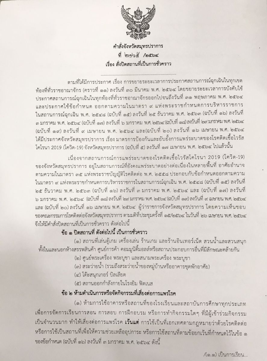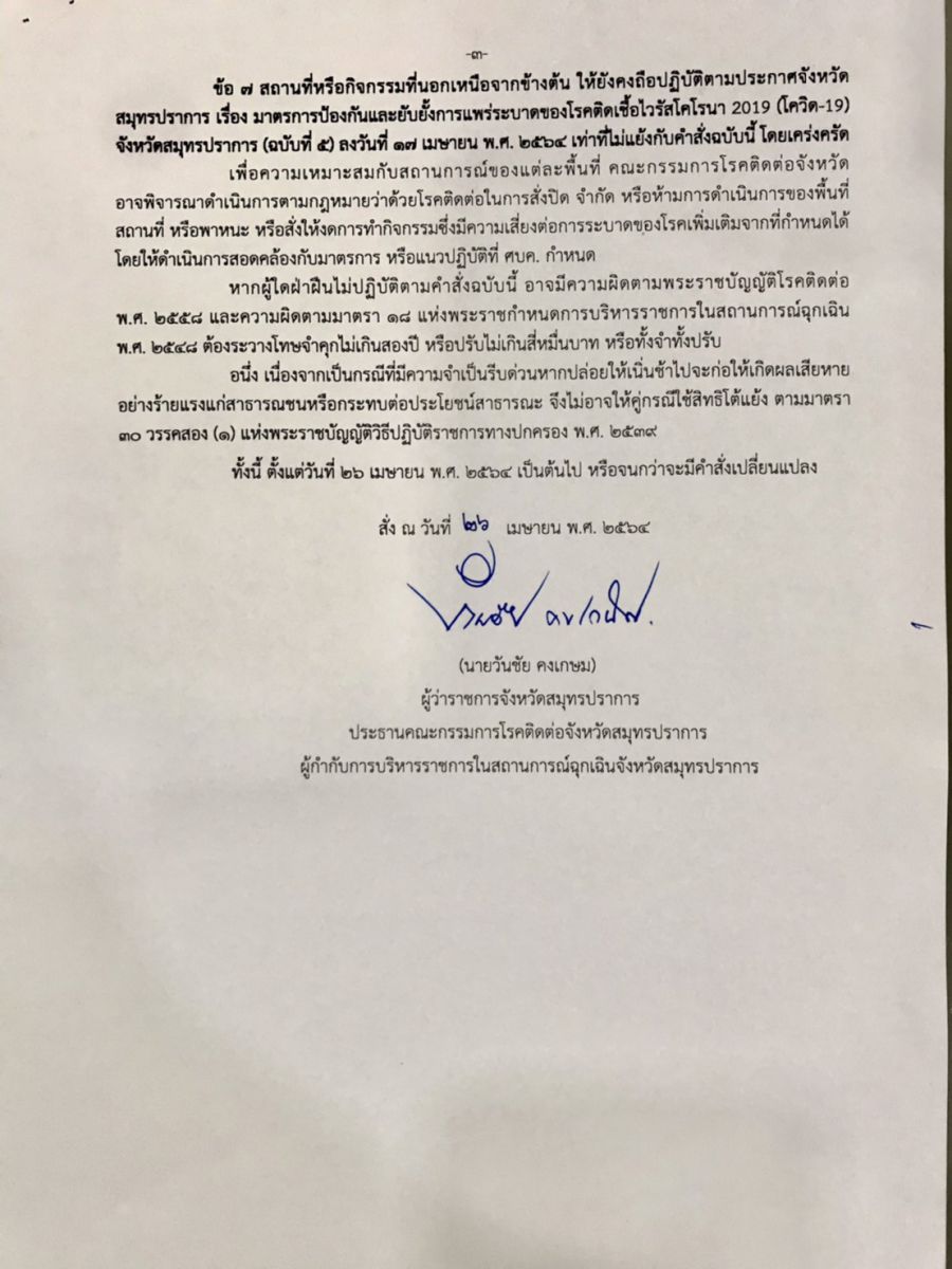 คำสั่งจังหวัดสมุทรปราการ สั่ง ณ วันที่ 26 เมษายน 2564
