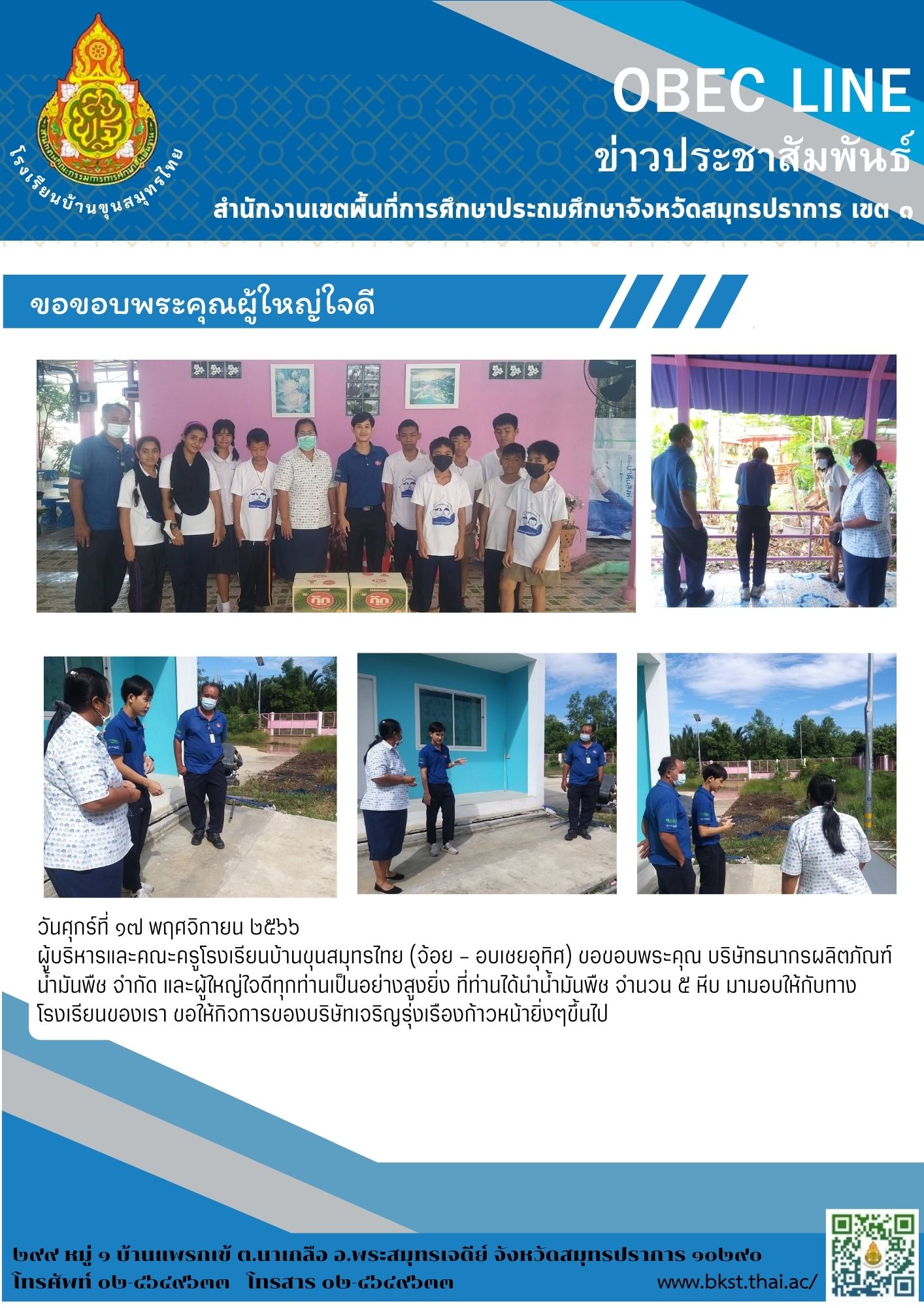 วันศุกร์ที่ ๑๗ พฤศจิกายน ๒๕๖๖ ผู้บริหารและคณะครูโรงเรียนบ้านขุนสมุทรไทย (จ้อย - อบเชยอุทิศ) ขอขอบพระคุณ บริษัทธนากรผลิตภัณฑ์น้ำมันพืช จำกัด