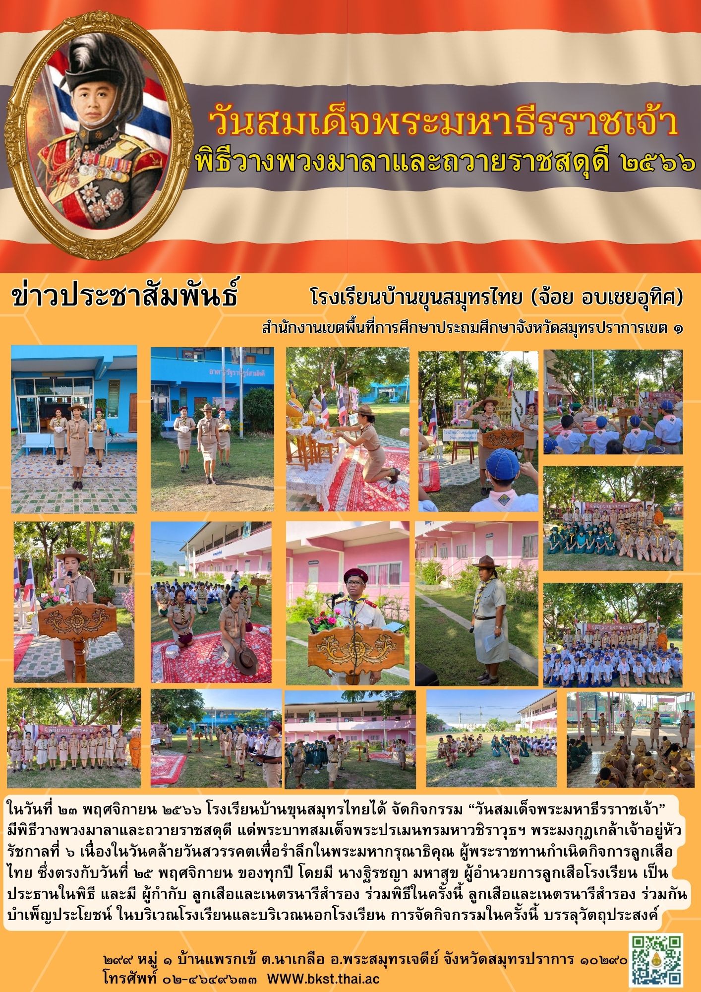 โรงเรียนบ้านขุนสมุทรไทย (จ้อย - อบเชย อุทิศ) จัดพิธีถวายราชสดุดี ?วันสมเด็จพระมหาธีรราชเจ้า? และกิจกรรมบำเพ็ญประโยชน์ เนื่องในวันคล้ายวันสวรรคตของ พระบาทสมเด็จพระมงกุฎเกล้าเจ้าอยู่หัว รัชกาลที่ 6