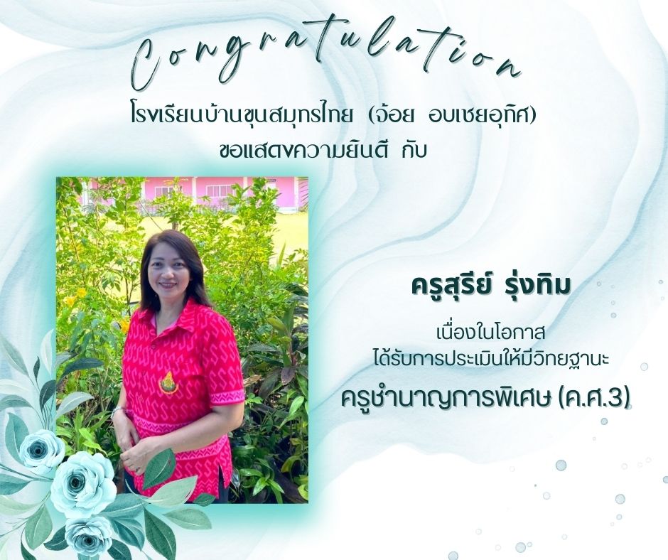 โรงเรียนบ้านขุนสมุทรไทย (จ้อย อบเชยอุทิศ) ขอแสดงความยินดี กับ ครูสุรีย์ รุ่งทิม เนื่องในโอกาสได้รับการประเมินให้มีวิทยฐานะ ครูชำนาญการพิเศษ (ค.ศ.3)