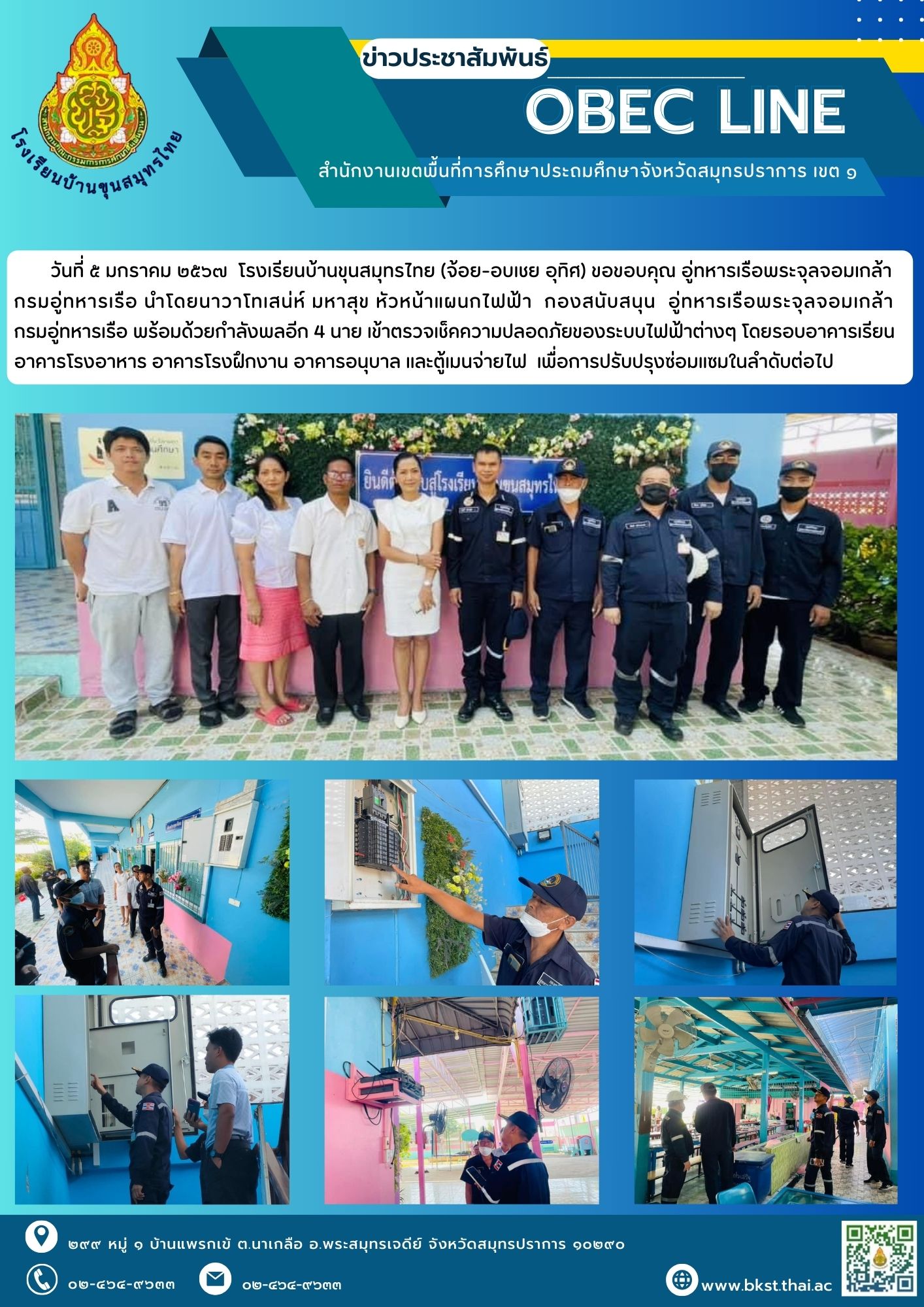 นาวาโทเสน่ห์ มหาสุข หัวหน้าแผนกไฟฟ้า กองสนับสนุน อู่ทหารเรือพระจุลจอมเกล้า กรมอู่ทหารเรือ พร้อมด้วยกำลังพลอีก 4 นาย เข้าตรวจเช็คความปลอดภัยของระบบไฟฟ้าต่างๆ โดยรอบอาคารเรียน