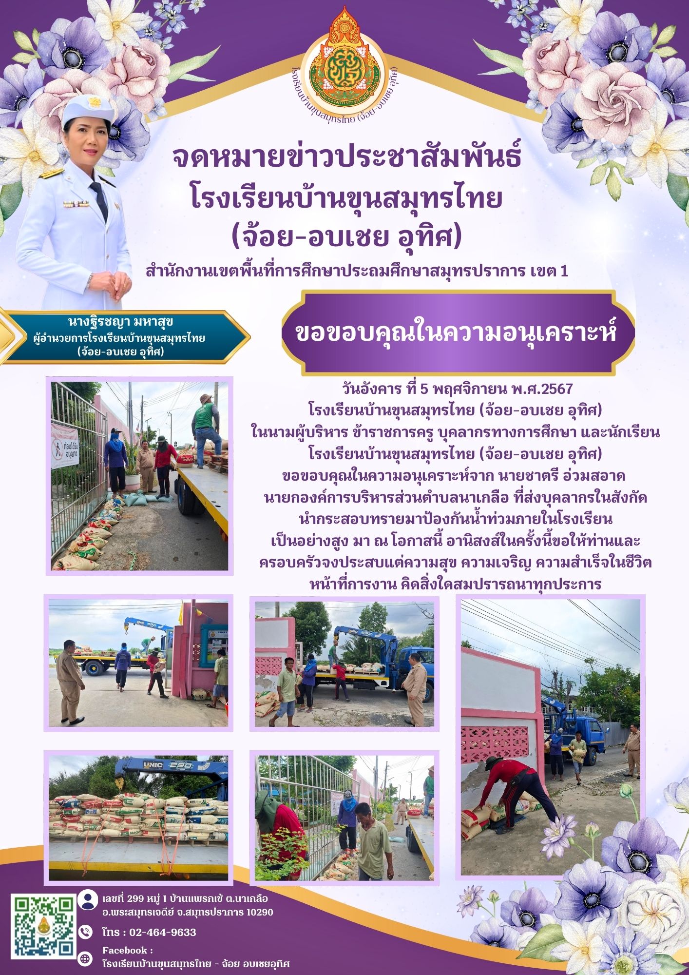 ขอขอบคุณในความอนุเคราะห์ อบต.นาเกลือ นำกระสอบทรายมาป้องกันน้ำท่วมภายในโรงเรียนบ้านขุนสมุทรไทย