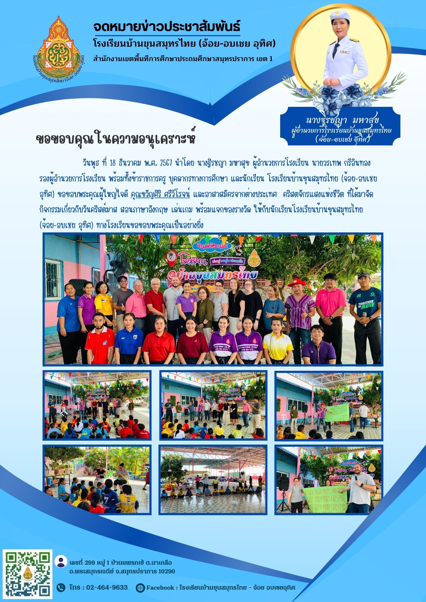 ขอขอบพระคุณ คุณขวัญศิริ ศรีวิโรจน์ และอาสาสมัครจากต่างประเทศ คริสตจักรแห่งชีวิต ที่ได้จัดกิจกรรมเกี่ยวกับวันคริสต์มาส สอนภาษาอังกฤษให้กับนักกเรียนบ้านขุนสมุทรไทย