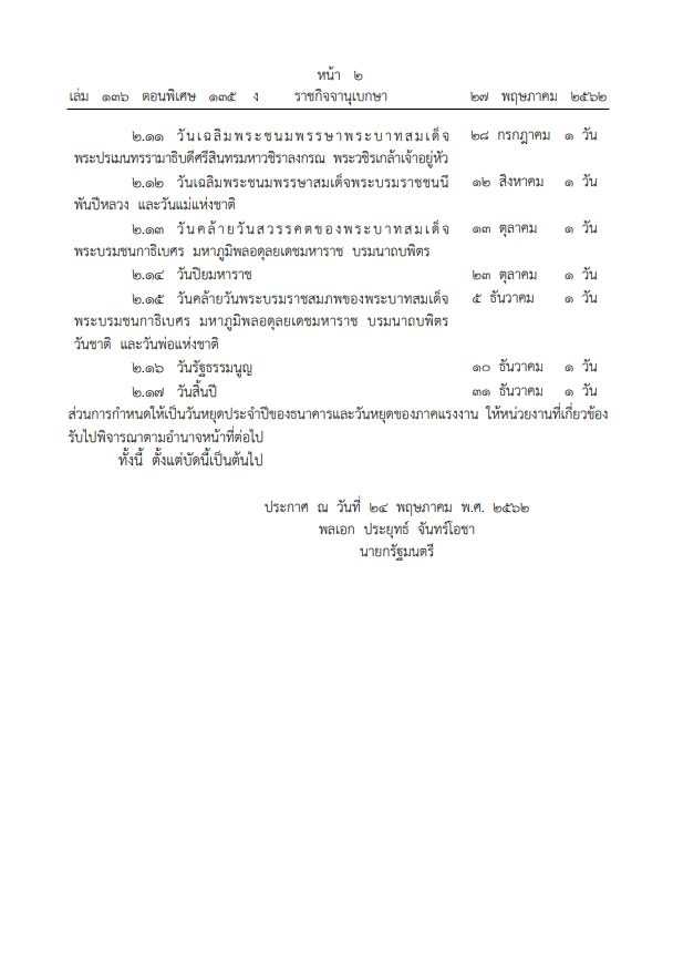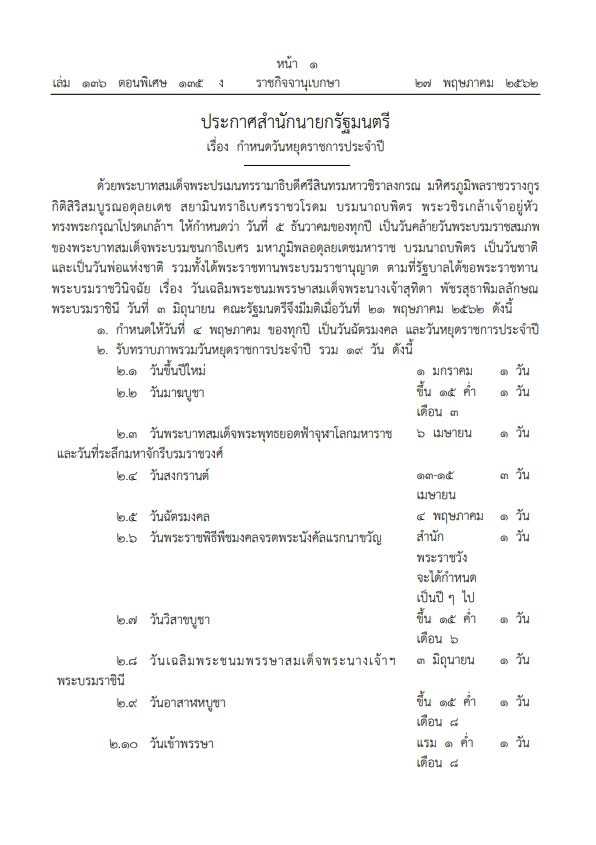 ประกาศสำนักนายกรัฐมนตรี เรื่องกำหนดวันหยุดราชการประจำปี