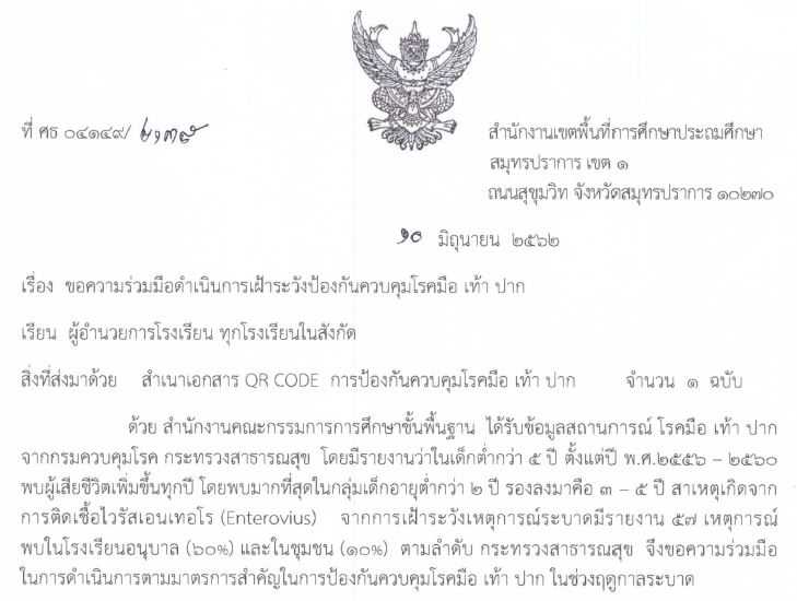 ขอความร่วมมือดำเนินการเฝ้าระวังป้องกันควบคุมโรค มือ เท้า ปาก